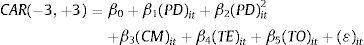 12 Como una forma de validar la robustez de los resultados del modelo 3, se corrió el mismo modelo, pero utilizando como variable dependiente los CAR (–1, +1) y (–5, +5), y en ambas regresiones se obtuvieron coeficientes negativos y significativos para PD y positivos y significativos para PD2. Estos resultados no son reportados en el presente trabajo por restricciones de espacio.