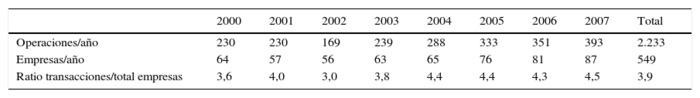 El análisis se centra solo en operaciones de compra, debido al mayor contenido informativo de estas operaciones soportado en un gran número de trabajos (Fidrmuc et al., 2006; Del Brio et al., 2010; Korczak, Korczak y Lasfer, 2010). Se tomó el 2007 como el último año de la muestra, ya que a finales de este año el mercado de capitales inició su declive derivado de la crisis financiera europea, por lo que incluir periodos más allá del 2007 generaría mucho ruido en los resultados.