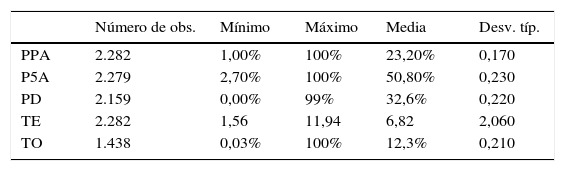 P5A: suma de la propiedad de los primeros 5 accionistas; PD: propiedad directiva; PPA: participación en la propiedad de la empresa del principal accionista; TE: logaritmo natural del valor de mercado de la empresa; TO: ratio entre el número de acciones de la operación y el número total de acciones en circulación.