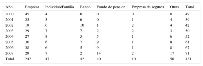 2 Los autores utilizan variables dummy que identifican el tipo de accionista cuando estos tienen una participación de al menos el 5% del capital.