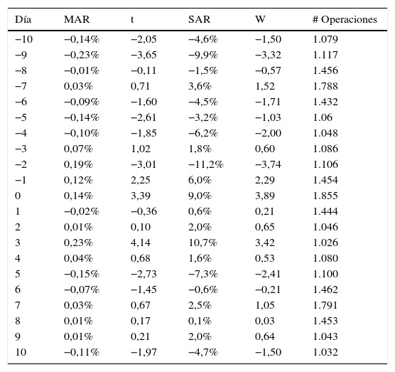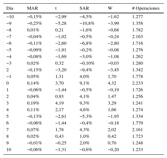 Tabla 4 Retornos anormales, retornos anormales estandarizados y test de significación. Modelo de mercado