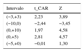 De igual forma, se utilizó el estadístico t-CAR para el análisis de sensibilidad de los retornos anormales medios acumulados de los diferentes intervalos que se contrastan, así como el estadístico Z medio de Dodd y Warner (1983), también para retornos acumulados.