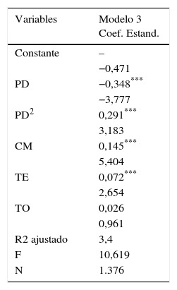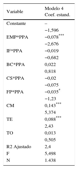 La tabla 2 muestra los resúmenes estadísticos de las principales variables. Se observa que la participación media del principal accionista (PPA) es del 23,2%; la de los primeros 5 accionistas (P5A) es del 50,8%, y la propiedad de los insiders (PD) es del 32,6%. En cuanto a las variables de control se incluyeron el tamaño de empresa (TE), utilizando como proxy el logaritmo del valor de mercado de la empresa al 31 de diciembre del año en que se realizó la operación y el tamaño de la operación (TO), para lo cual se utilizó como proxy la ratio entre el número de acciones de la operación y el número de acciones en circulación al 31 de diciembre del año en que se realizó la operación. La transformación de las variables de control se justifica en la medida en que su inclusión en sus valores absolutos puede generar problemas de heterocedasticidad y correlaciones espurias.