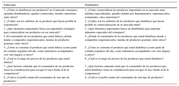 Para la entrevista en profundidad se diseñó un protocolo de preguntas. El protocolo contenía una guía de preguntas semiestructuradas abiertas y cerradas, las cuales se adaptaron y se tradujeron al inglés para las entrevistas a los distribuidores. Las preguntas se organizaron bajo bloques temáticos como sugieren expertos en el diseño de protocolos de preguntas (Turner, 2010; Miles y Huberman, 1994; Yin, 2009; Hernández, Fernández y Baptista, 2004; Tellis, 1997; Zainal, 2007).