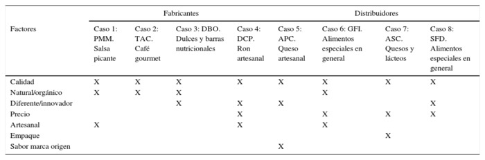 Los casos entrevistados son pymes establecidas en Puerto Rico con menos de 20 años de operación. Estas empresas elaboran productos a escala pequeña, entre los cuales destacan el café, salsas, licor, dulces típicos y frutas y vegetales exóticos tropicales. Con relación a los factores que el fabricante de alimentos especiales entiende que el distribuidor toma en consideración para comercializar sus productos en el extranjero, todos concuerdan que el primer factor es la calidad del producto. Se observa que, aunque no lo mencionan de forma explícita, la calidad es vista como un conjunto de atributos que incluyen sabor, presentación, ingredientes y certificaciones que garantizan formas de elaboración y procesamiento. Sin embargo, para ellos estos atributos que forman parte del concepto de calidad son mencionados de forma separada; es decir, todos concuerdan que el factor principal que entienden que el distribuidor toma en consideración para la comercialización de sus productos en el extranjero es la calidad, seguido por producto 100% natural, diferente/innovador, artesanal. Solamente una empresa indicó el precio como factor importante (tabla 2). Finalmente, los fabricantes de alimentos especiales puntualizan que los mercados foráneos potenciales para la distribución y venta de sus productos lo configura el mercado nicho de población latina en Estados Unidos, así como consumidores (restaurantes) de las islas del Caribe.