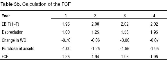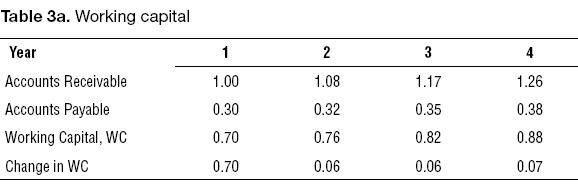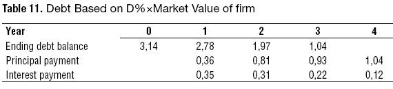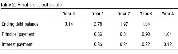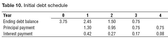Sales start with $10 in year 1. The fixed assets cost $4. The expected ending balance for the initial debt is shown in Table 2.