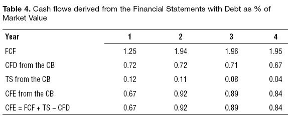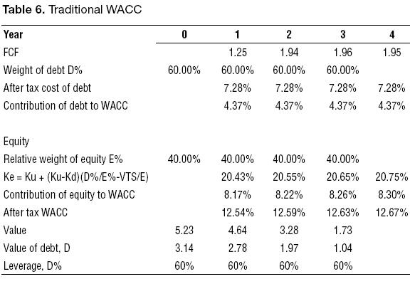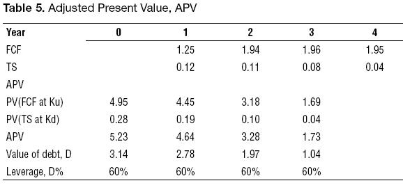 Observe that the value calculated assuming ψ equal to Kd is higher than the value when we assume that ψ equal to Ku. A question arises here: is it reasonable to think that, changing the financing policy from constant leverage to predetermined debt schedule (non constant leverage), the firm will increase its value? We leave the answer to this question for another work.