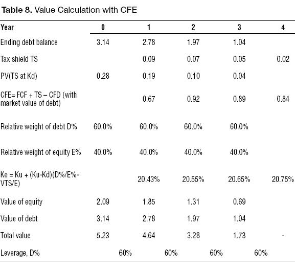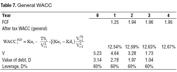 With this information we can perform the valuation of the cash flows. In the next tables we show the valuation for each method after solving the iteration process to solve the circularity between value and discount rate, where necessary.
