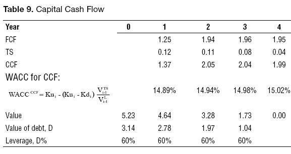 Taggart (1991) presents a revision of the set of formulations for the cost of levered Ke and WACC for perpetuities and finite cash flows. He introduces the formulation with and without personal taxes and for different level of risk for discounting the TS, including the Miles and Ezzell (1980). However, Taggart does not include the case of ψ = Kd for finite cash flows. Inselbag and Kaufold (1997) include the formulation of Ke and WACC for the case of Kd, the cost of debt as the level of risk for the TS and finite cash flows, but neither Taggart (1991) nor Inselbag and Kaufold (1997) show the formulation for the cost of capital appropriate to discount capital cash flow (CCF) under ψ = Kd and finite cash flows scenario.
