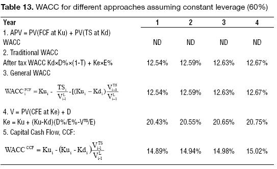 Observe that the WACCCCF is not constant even if we assume that Ku is constant. WACCCCF is constant and equal to Ku (assuming no change in the operating risk for the firm and constant inflation) when we assume that the discount rate for the TS is Ku. The reason is identical to the one that makes Ke and WACCFCF non constant when leverage is constant and we assume the risk of TS equal to Kd: Ke, WACCFCF and WACCCCF depend on the value of TS.