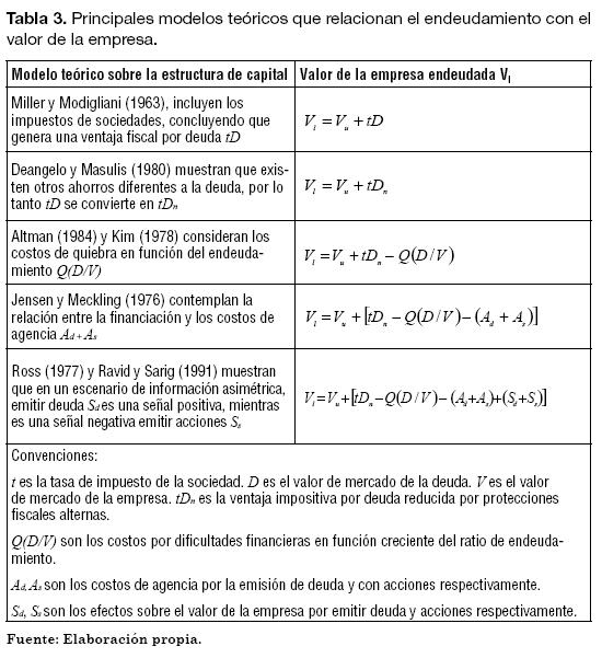 Aunque no existe un macro-modelo que integre todas las propuestas teóricas del trade off, en la columna izquierda de la Tabla 3 se acumulan los efectos sobre el valor de la empresa que cada una de ellas estima.