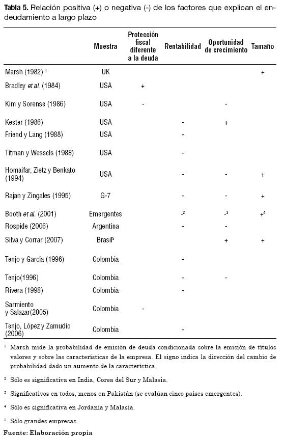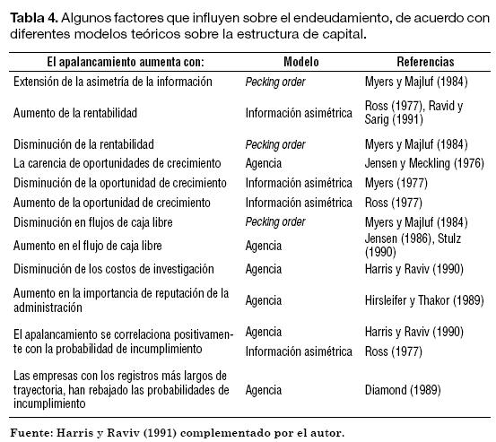 En las anteriores teorías se han examinado varios factores explicativos de la estructura de capital; entre los más comunes están la estructura de capital a corto plazo, la volatilidad de las utilidades, la protección fiscal diferente a la deuda, la oportunidad de crecimiento, la rentabilidad, la retención de utilidades, el activo tangible, el tamaño de la firma, el costo de la deuda, la edad de la empresa, el flujo de caja libre y la inversión en investigación, desarrollo e innovación. En la Tabla 4 se seleccionan los factores más relevantes para esta investigación, según los resultados a presentarse en el apartado 4.2, y se relacionan con el endeudamiento.