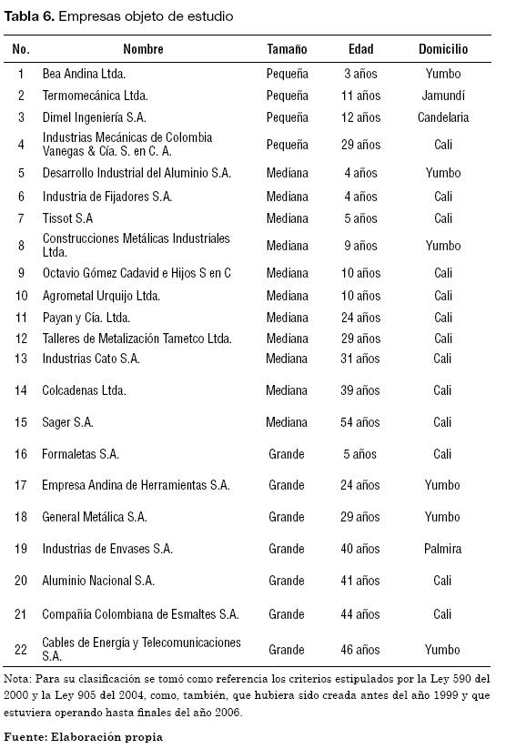 Se estudia un total de 22 empresas del Valle del Cauca,2 de las cuales cuatro son pequeñas, once medianas y siete grandes; trece radicadas en Cali, seis en Yumbo y una en Palmira, Candelaria y Jamundí.