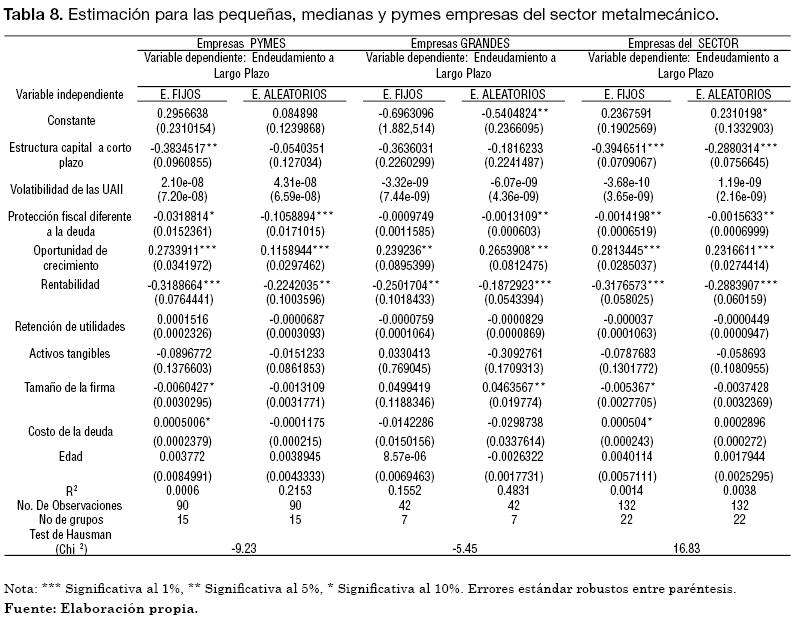 Los resultados de las estimaciones para todo el sector metalmecánico, y por cada uno de los grupos de acuerdo con su tamaño (grande y pyme), se presentan en la Tabla 8. En todos los casos, el Test de Hausman señala que no se debe rechazar la hipótesis nula, por lo tanto es mejor utilizar el modelo de efectos aleatorios.
