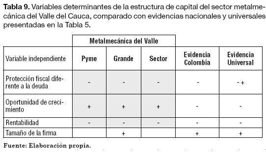 Los factores determinantes de la decisión de financiación a largo plazo de las empresas del sector metalmecánico del Valle del Cauca, de pruebas nacionales e internacionales, y el signo (+, -) de su relación con el endeudamiento a largo plazo se muestran en la Tabla 9.