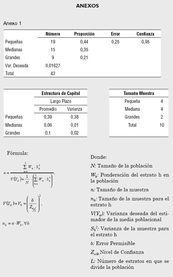 2. El tamaño de la población encontrado para el 2006 corresponde a 19 empresas pequeñas, 15 medianas y 9 grandes según Supersociedades (ver Cuadro 1). Mediante un muestreo aleatorio estatificado se seleccionó al azar una muestra de pequeñas, otra de medianas y otra de grandes, se determinaron las proporciones, las varianzas y se fijó un error absoluto y un nivel de confianza, tomando como criterio la variable de estructura de capital de largo plazo que es primordial para el estudio. El resultado obtenido fue una muestra de 10 empresas con un nivel de confianza del 95%, como se muestra en el Anexo 1. Se tomó una muestra más amplia, de la sugerida por el modelo, por su disponibilidad en Supersociedades, lo que mejora su representatividad.