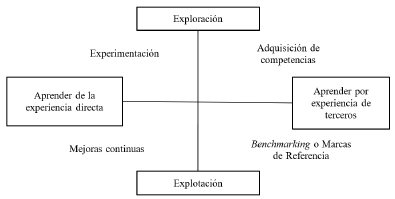 Las formas secundarias son dos y están opuestas entre sí; se les conoce como la exploración y la explotación del conocimiento. Una organización explora cuando busca nuevos métodos, productos o formas de realizar actividades a partir de lo que ya conoce y domina, mientras que la explotación centra su atención en realizar solo lo conocido y se preocupa por hacerlo de la mejor manera (Yeung et al., 2000).