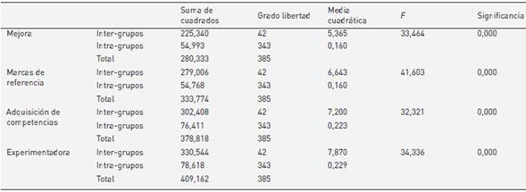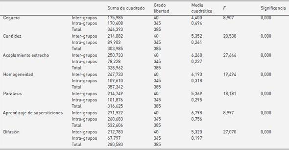 Para identificar si existen diferencias estadísticamente significativas entre los grupos de estudio (incapacidades y estilos de aprendizaje) se hizo un análisis de varianza (ANOVA) con una prueba F, con un nivel de confianza del 95%. Los resultados de esta prueba se observan en las tablas 7 y 8. En los dos casos los resultados obtenidos confirman la validez, es decir, no existen diferencias estadísticamente significativas entre las incapacidades y estilos de aprendizaje.