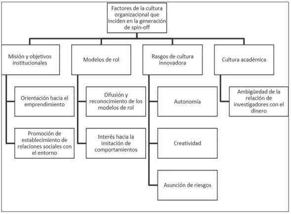 En este sentido, el panorama resulta retador para las universidades, por lo que en el análisis de cómo forjar el camino para la transferencia de conocimiento a través de spin-off, la literatura ha identificado diversos tipos de factores que facilitan o inhiben esta actividad, uno de ellos es la cultura organizacional, en la cual se consideran la misión, los objetivos institucionales, la historia, la tradición de la universidad y la orientación hacia el emprendimiento, como elementos fundamentales en la generación de spin-off (Cáceres y Aceytuno, 2015; O’Shea, Allen, Chevalier y Roche, 2005).
