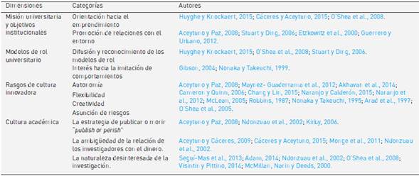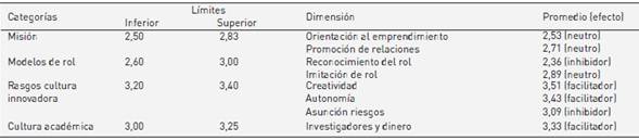 Tabla 7 Categorías y dimensiones de la cultura universitaria que inhiben o facilitan las spin-off.