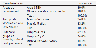 Para caracterizar la cultura base se aplicó un cuestionario a investigadores categorizados por Colciencias. De 1.940 docentes de planta de la universidad, 155 respondieron la encuesta, lográndose una tasa de respuesta del 7,9%. Del total de investigadores que participaron en el estudio 60% hacen parte de las áreas STEM (ciencia, tecnología, ingeniería, matemáticas; por sus siglas en inglés), un 63,2% se encuentra vinculado hace más de 5 años y un 81,9% hace parte de un grupo de investigación categorizado por Colciencias (tabla 2).