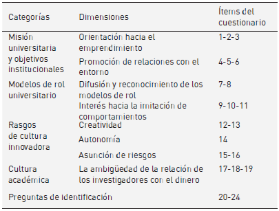 Para conocer las percepciones de los profesores sobre las características culturales definidas -cultura base-, se elaboró un cuestionario, cuya estructura corresponde a las categorías y dimensiones construidas en el modelo teórico. Los ítems de cada dimensión se identifican en la tabla 3.