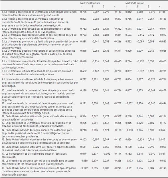 Las cuatro dimensiones explican el 55,65% de la varianza total de los ítems. Es de destacar que se analizó la ausencia de sesgo del método común -common method bias-, para tal fin se realizó el test de Harman bajo un solo factor, el cual reveló comunalidades y cargas factoriales bajas en 8 de los 19 ítems, y una varianza total explicada por el factor cercana al 30%, lo que pone de manifiesto ausencia de sesgo del método común. Todo lo anterior permite identificar la existencia de cuatro dimensiones.