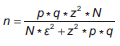 Donde n es el número de elementos de la muestra, N es el número de elementos del universo, p y q son, respectivamente, la probabilidad de éxito y de fracaso asociada al suceso, Z es el valor crítico correspondiente al nivel de confianza elegido asociado con una distribución normal a dos colas y ε es el margen de error permitido.