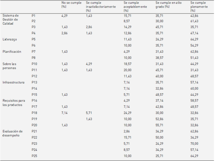 Con respecto al factor liderazgo, el 100% de los encuestados consideran que en general este se cumple aceptablemente, en alto grado y plenamente. Es de resaltar que este factor no presentó valoraciones de no cumplimiento o cumplimiento insatisfactorio, por lo que se deduce que la alta dirección ha demostrado su liderazgo y compromiso con respecto al sistema de gestión de calidad, asegurándose de que los objetivos y la política de calidad se establecen y son compatibles con la dirección estratégica y con el contexto de la organización. Marin y Vanoni (2016) destacan la importancia de las competencias para manejar este tipo de escenarios, destacando que todas las capacidades, conocimientos, habilidades, actitudes y destrezas no poseen ningún valor si no se logra guiar y desarrollar el desempeño eficaz de las tareas, logrando el éxito organizacional y la realización plena de la persona, que según lo expone Serrano (2017), es el único camino efectivo para dotarle sentido a la función directiva.