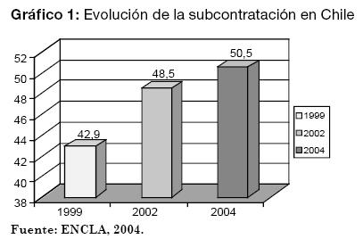 En términos generales, en Chile la subcontratación ha presentado un leve pero sostenido aumento. De acuerdo con el Gráfico 1, en el año 1999 las empresas que poseían al menos una actividad subcontratada representaban el 42,9%, cifra que para el año 2002 alcanzó niveles superiores al 48%, aumentando en el año 2004 hasta superar el 50%, es decir, más de la mitad de las empresas han subcontratado al menos una de sus actividades (Encuesta Laboral, 2004) (Ver Gráfico 1).