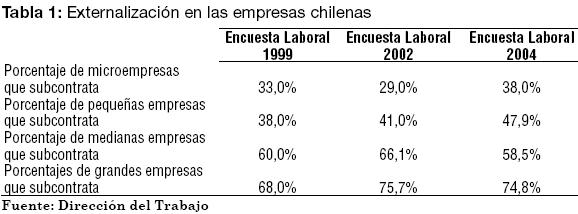 Dentro de todas las empresas, las que más externalizan servicios, son las grandes empresas, cuyo porcentaje llegó el año 2004 a prácticamente donde el porcentaje no alcanza el 40% (ver Tabla 1).