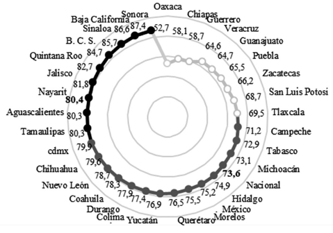 En el caso de los usuarios con acceso a servicio de internet, Nayarit se ubica nuevamente en un grupo intermedio de entidades federativas, con una cobertura ligeramente mayor al promedio nacional. Los criterios de agrupación para este caso fueron: a) un grupo superior, en el cual el 65% o más de la población tuvo acceso al servicio; un grupo intermedio, con valores que van desde el 55% hasta el 65%; así como un tercer grupo con un mayor rezago en acceso a internet, donde menos del 55% de su población contó con el servicio (figura 3).