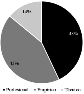 Así mismo, la perspectiva del personal de las EAACM dedicado a la captación y procesamiento de información, afirma que se requiere solo de capacitación básica para captura de registros contables e impuestos, o bien, de documentos internos de la empresa. Esos individuos presentan un perfil profesional (43%) o técnico (14%) que rebasa el estándar de capacidades comúnmente requeridas por los usuarios de esas tecnologías (figura 5); sin embargo, no se excluye que aquellos sujetos que no pertenecen a ese segmento de calificación (43%) puedan ser capacitados, especialmente quienes poseen educación media y media superior.