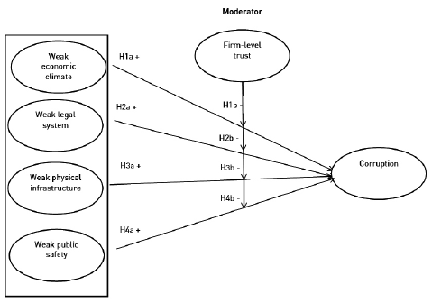 This paper is structured as follows: section 2 provides the theoretical framework and hypotheses; section 3 explains the methods used to analyze empirically the weak institution - perceived corruption relationship and the moderating effects of firm-level trust; section 4 discusses the results; and finally, section 5 offers conclusions, recommendations for practice and research, and limitations.