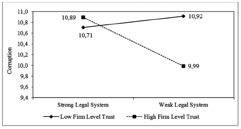 In countries where the legal system is weak, employees who have high firm-level trust will find the legal system - corruption relationship to be weaker, compared with people who have low firm-level trust. In organizations where firm-level trust is high, people may be assured that the policies and procedures that they experience internally extend to how the firm behaves, even in a weak legal environment. Employees will trust that their firms are not above the law, and that firms will comport themselves in ways that are honest, legal, and moral, remaining separate from the threats and distractions of a challenging legal environment. Employees with high firm-level trust are likely to observe honest and legal behavior from managers and subordinates in the firm, concluding that corruption, while it exists outside the firm, is not closely coupled with a weak legal system. However, employees who have low trust in their firms may experience dishonest behavior in the firm, and conclude there is little difference between the corruption they see inside and outside their firms (Hatak, Fink, & Frank, 2015). Low trust may convince them that their firms and public institutions are equally corrupt, thereby associating corruption with the weak legal and moral behavior that surrounds them. Based on these two arguments, we pose: