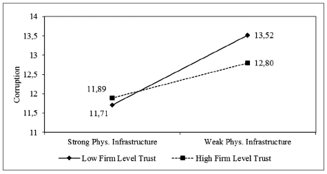 Yet trust can change that association. Where perceived corruption is high and physical infrastructure is weak, people who have high levels of trust in the firms they work for will perceive the physical infrastructure - corruption relationship to be weaker. Employees who have high firm-level trust are likely to think that physical and other conditions in which they work are positive, surmising that the firm takes care of them in a way that prevents them from being distracted by weak physical infrastructure outside the firm. People who have high firm-level trust think their firms have found ways to overcome the problems that result in poor or unattended infrastructure, because those kinds of conditions do not exist in their firms. In fact, high firm-level trust suggests there is limited or no corruption in the firm, so people believe corruption is not as strongly associated with the country's weak physical infrastructure.