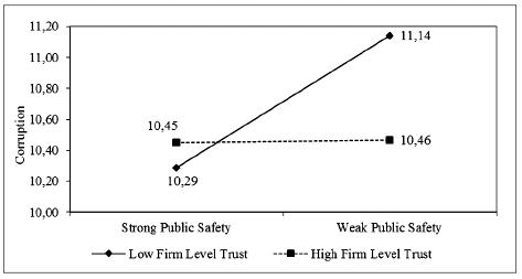 In places where public safety is weak, corruption is perceived to be high; however, if employees have high levels of trust in the firms they work for, they will perceive the public safety - corruption relationship to be weaker, when compared with those who have low firm-level trust. Employees who have high firm-level trust are more likely to believe that the firms they work for will protect them from the threats and distractions of corrupt public safety officials, despite the fact that their firms operate within that context of public safety corruption. High firm-level trust may allow employees to believe that they are protected from many possible instances of impunity or overt abuse of law enforcement power that could occur, because the firm itself is trustworthy, even if that impunity is rampant outside the firm. High firm-level trust suggests that employees probably experience little or no abuse of power by authorities within the firm, and that trust may suggest that the corruption that exists in the broader, institutional environment is not as strongly connected with weakness in the public safety authority. However, if employees experience low trust in the firms they work for, they may find abuses of power within their firms, and find little difference between abuses in their companies and impunity demonstrated by public safety institutions (Peña López & Santos, 2014). Because they see corruption and abuse in their firms, they are more likely to expect corruption to be associated with abuse and poor public safety enforcement. For these reasons, we pose these hypotheses: