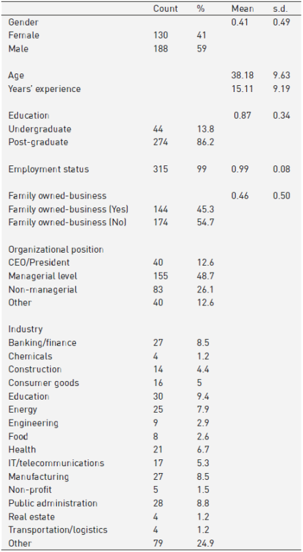 Recognizing that this was a convenient sample, a descriptive analysis indicates that the sample is representative of a broad based industry and employment level. The sample of individuals we surveyed included owners, CEOs, presidents, general managers, directors, supervisors and employees. It reflects a population of active and engaged business professionals, and is stratified enough to present an array of individual-level perceptions about corruption, public institutional strength, and firm-level trust. We received 548 responses and due to missing data, 318 were usable: 93 of the subjects were from Mexico, and 225 were from Peru. The average age was 38, with 41% female and 59% male. We controlled for education, with 14% of the respondents having an undergraduate degree and 86% holding a post-bachelor degree. Nearly 45% of respondents were associated with a family-owned business. We also controlled for position within the firm and industry. Finally, we measured firm size by the number of employees (avg. = 4622.59, s.d., 28260.54). As a result, we believe this sample adequately represents a cross section of business and managerial participants. Table 2 highlights the independent and dependent variables descriptive statistics and correlations. Table 3 highlights the control variables' descriptive information, including percentages.