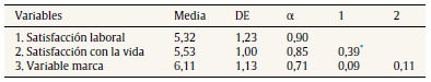La tabla 1 muestra los estimados de consistencia interna de las variables involucradas en este estudio así como las correlaciones bivariadas entre ellas. Como se observa, los valores medios de la variable marca son los mayores; así también, la media de satisfacción con la vida es mayor a la de satisfacción laboral. Los estimados de consistencia interna son aceptables en todos los casos.