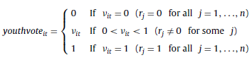 where youthvote it denotes the voter-registration rate, i.e. youth vote ratio, in county i at time t, r j is the enrollment decision of a citizen j that resides in a county populated by n individuals, and it