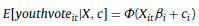 where Φ(·) is the standard normal cumulative distribution function, the regressors lnincome, particip, ethnic, registrar, rural, and ballot are defined as above, ηit is the idiosyncratic error, and the unobserved heterogeneity ci is distributed