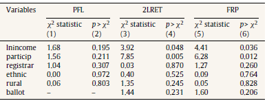 where the variables lnincome, particip, registrar, ethnic, and rural are defined as above. In this second empirical specification, year dummies were replaced with the binary variable ballot in order to control the effect of an impending election on voter registration. That is, the variable ballot takes the value of one if an election is held in time t and zero otherwise. During the sample period, three elections were held in Chile: the 2000 mayoral election, and the 2009 presidential and congressional elections. Finally, c