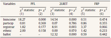 Table 2 Estimates of the pooled fractional logit (PFL), two-limit random effects Tobit (2LRET), and fractional response probit (FRP) models for youth vote ratio, all counties.