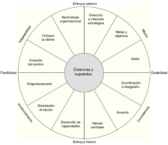 Por otra parte, Denison et al. (2003) describen un modelo de cultura organizacional como una teoría que se relaciona con el desempeño de la empresa representado como un círculo, en cuyo centro se encuentran las creencias y los supuestos de la organización como el corazón de la organización.