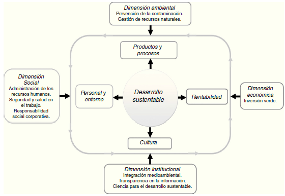 Con base en lo anterior, Carro et al. (2017) proponen el modelo mostrado en la figura 2, visualizando las cuatro dimensiones de sustentabilidad desde la siguiente perspectiva: en la dimensión ambiental se considera que los productos y procesos deben ser amigables con el ambiente a través de la prevención de la contaminación y de una buena gestión de los recursos naturales, reconociendo el diseño de productos verdes desde su materia prima hasta el final de su ciclo de vida. En la social se busca el beneficio del personal y de su entorno con una eficiente administración de los recursos humanos, brindando salud, seguridad y crecimiento económico, tanto a la organización como al personal y al lugar donde se ha establecido la empresa. En la dimensión económica se plantea la propuesta de una rentabilidad tanto económica como social, en la búsqueda de generar resultados y/o beneficios con base en la inversión en tecnología para disminuir el consumo de energía y mejorar la calidad ambiental de los procesos, concibiendo, además, que su objetivo no solo es generar ganancias económicas, sino también devolver algo a la sociedad a nivel social, económico y ambiental que le permita a la empresa un arraigo de forma permanente. Finalmente, en la dimensión institucional el modelo propone la creación de una cultura sustentable, con una misión y visión que impacte en todos sus integrantes, estableciendo normas, hábitos y valores para que se practiquen dentro y fuera de la organización, haciendo de ellos una nueva forma de comportamiento y de educación.