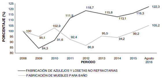 La figura 3 muestra que, a pesar de presentarse una caída en 2009, a partir del 2014 el IVP de azulejos y muebles sanitarios registró una notable recuperación, alcanzando su mayor nivel en 2016, tomando como referencia los datos de 2008.