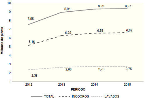 De forma individual, en la figura 4 se muestra la cantidad de producción de muebles sanitarios -inodoros y lavabos- en piezas por año en México.