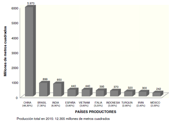 Figura 6 Producción de recubrimientos cerámicos en el mundo en 2015.