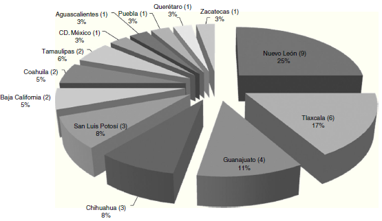 Se destaca en primer lugar el Estado de Nuevo León con nueve empresas instaladas y en operación, lo que representa el 25% del total. En segundo lugar el estado de Tlaxcala con seis (17,00%) y en tercero, Guanajuato con cuatro (11%).