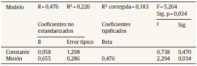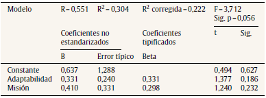 En los modelos de regresión simple, la variable predictora con mayor influencia es adaptabilidad, ya que el valor de F = 5,717 es mayor que el de misión (F = 5,264), lo que indica que la primera variable explica mejor el modelo. No obstante, esta influencia es débil ya que solo el 22,6% revela la percepción sobre qué tan determinante es su influencia en la variable dependiente, así como el hecho de que su importancia relativa es del 47,6%.